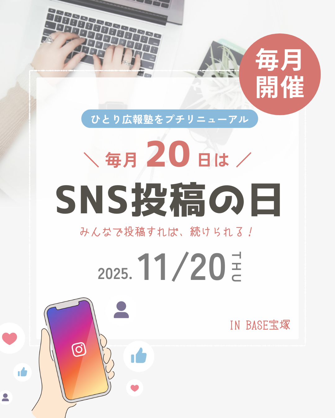 毎月20日(土日祝の場合は20日前後)はBASE宝塚に集まってみんなでSNSやブログを投稿をしましょう!